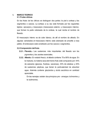 Este documento describe las características de las frutas cítricas y sus componentes. Se divide en varias secciones: la primera describe las partes de los frutos cítricos como la corteza y los segmentos. La segunda sección detalla la composición del fruto, incluidos los pigmentos, azúcares y vitaminas encontrados en la corteza y la pulpa. La tercera sección describe los diferentes tipos de naranjas, como las dulces, blancas y sanguinas. La cuarta sección cubre el jugo de naranja concentrado congel