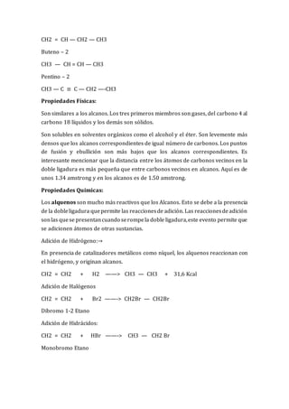 Los alquenos contienen una doble ligadura entre átomos de carbono que los hace más reactivos que los alcanos. Presentan isomería de posición debido a la ubicación de la doble ligadura. Los alquinos contienen una triple ligadura entre carbonos y su fórmula general es CnH2n-2.