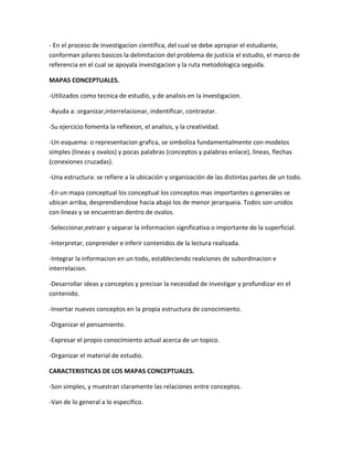 Este documento describe el marco teórico y los mapas conceptuales. Explica que el marco teórico se refiere a las teorías que sustentan un trabajo y proveen orden a las observaciones. También define las funciones del marco teórico como orientar el estudio, ampliar el horizonte e interpretar los resultados. Por otro lado, introduce los mapas conceptuales como una técnica para organizar, interrelacionar e identificar información de manera gráfica. Resalta que los mapas conceptuales deben mostrar claramente las relaciones entre conceptos en una estruct