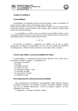 La permeabilidad es la propiedad de los suelos para transmitir agua. Cuanto más permeable es el suelo, mayor es la filtración. La permeabilidad se cuantifica mediante el coeficiente de permeabilidad, el cual depende de factores como la porosidad, tortuosidad y estructura del suelo. Existen métodos de laboratorio y de campo para determinar el coeficiente de permeabilidad, como permeámetros de carga constante o variable que miden la cantidad de agua que fluye a través de una muestra de suelo.
