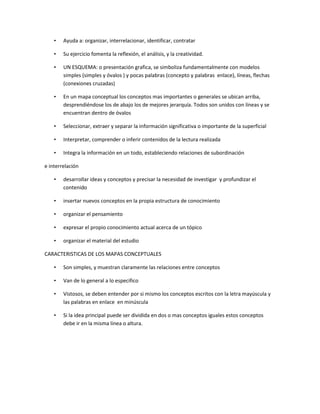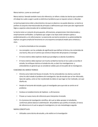 El documento describe el marco teórico y los mapas conceptuales. Explica que el marco teórico se refiere a las teorías que sustentan un trabajo y proveen orden a lo que se observa. También describe las funciones del marco teórico como orientar el estudio, ampliar el horizonte e interpretar los resultados. Finalmente, señala que los mapas conceptuales ayudan a organizar la información de manera gráfica mediante conceptos y conexiones entre ellos.