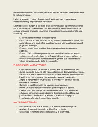 El marco teórico provee el contexto conceptual para el estudio al delimitar el problema e identificar las teorías relevantes. Se construye mediante la selección de conceptos clave y su organización lógica para mostrar cómo las teorías, hipótesis, y hallazgos previos guían la investigación. Los mapas conceptuales son una herramienta útil para organizar y visualizar las relaciones entre los diferentes componentes del marco teórico.