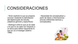 El documento presenta información sobre el marco teórico de una investigación. Explica que el marco teórico tiene como propósito ubicar el problema de investigación dentro de un corpus de conocimientos previos y proveer conceptos para desarrollar los términos de la investigación. También describe las diferentes partes de un marco teórico como el marco conceptual, marco de antecedentes y marco teórico, y explica sus funciones y la importancia de elegir teorías para guiar la investigación.