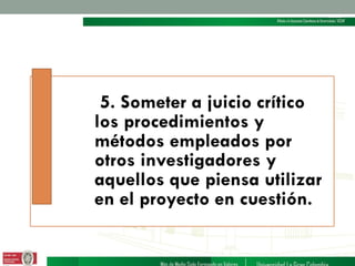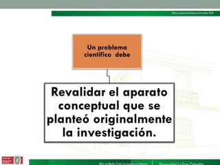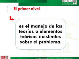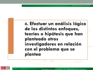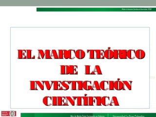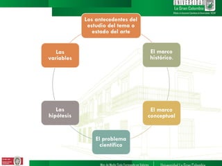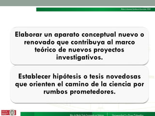 1. El documento describe la importancia del marco teórico, histórico y conceptual en la investigación científica. Explica que estos marcos son fundamentales para entender el problema de estudio, sus antecedentes y ubicarlo en un contexto más amplio. 2. También señala que la construcción de estos marcos requiere una revisión bibliográfica ordenada y la clasificación y verificación de fuentes para comprender mejor el objeto de estudio. 3. Además, indica que los marcos deben contribuir a los nuevos aportes