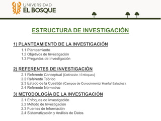 Este documento presenta los referentes de investigación para un proyecto de investigación. Explica que los referentes de investigación describen el estado actual y pasado del conocimiento sobre el problema de estudio a través de fuentes primarias y secundarias. Se dividen en cuatro secciones: 1) referente conceptual, que define los elementos del tema de estudio y reconoce los enfoques; 2) referente teórico, que explica el saber disciplinar; 3) estado de la cuestión, que analiza estudios previos y la evolución del tema; y 4) referente