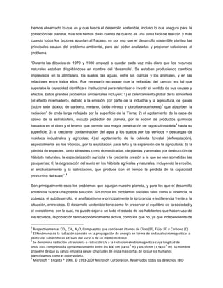 El documento describe el desarrollo sostenible y sus objetivos de lograr un desarrollo económico y social que proteja el medio ambiente para las generaciones futuras. Se formalizó el término en 1987 para abordar problemas como el calentamiento global, la contaminación, y la pérdida de recursos. El desarrollo sostenible busca armonizar tres pilares: lo social, económico y ambiental.
