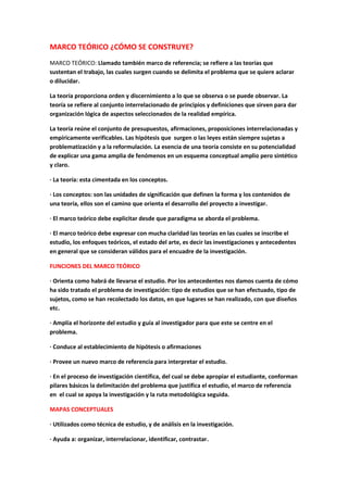 El documento explica cómo construir un marco teórico y describe su función. Un marco teórico se basa en teorías que sustentan el trabajo y surgen de delimitar el problema de investigación. Proporciona orden y comprensión de lo observado. También orienta el estudio, amplía el horizonte, guía al investigador y provee un marco para interpretar los resultados. Los mapas conceptuales también se describen como una técnica para organizar y analizar la información de manera gráfica.