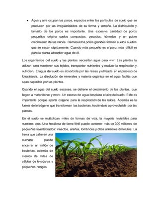 El documento describe las características del suelo, incluyendo su composición de minerales, materia orgánica, microorganismos, agua y aire. Explica que el suelo se forma lentamente a través de la descomposición de rocas y materia orgánica. También describe los factores que determinan la fertilidad de un suelo, como su consistencia, contenido de nutrientes, capacidad de retener agua y aireación. Finalmente, ofrece recomendaciones para conservar la fertilidad del suelo a través de prácticas como la rotación de cult