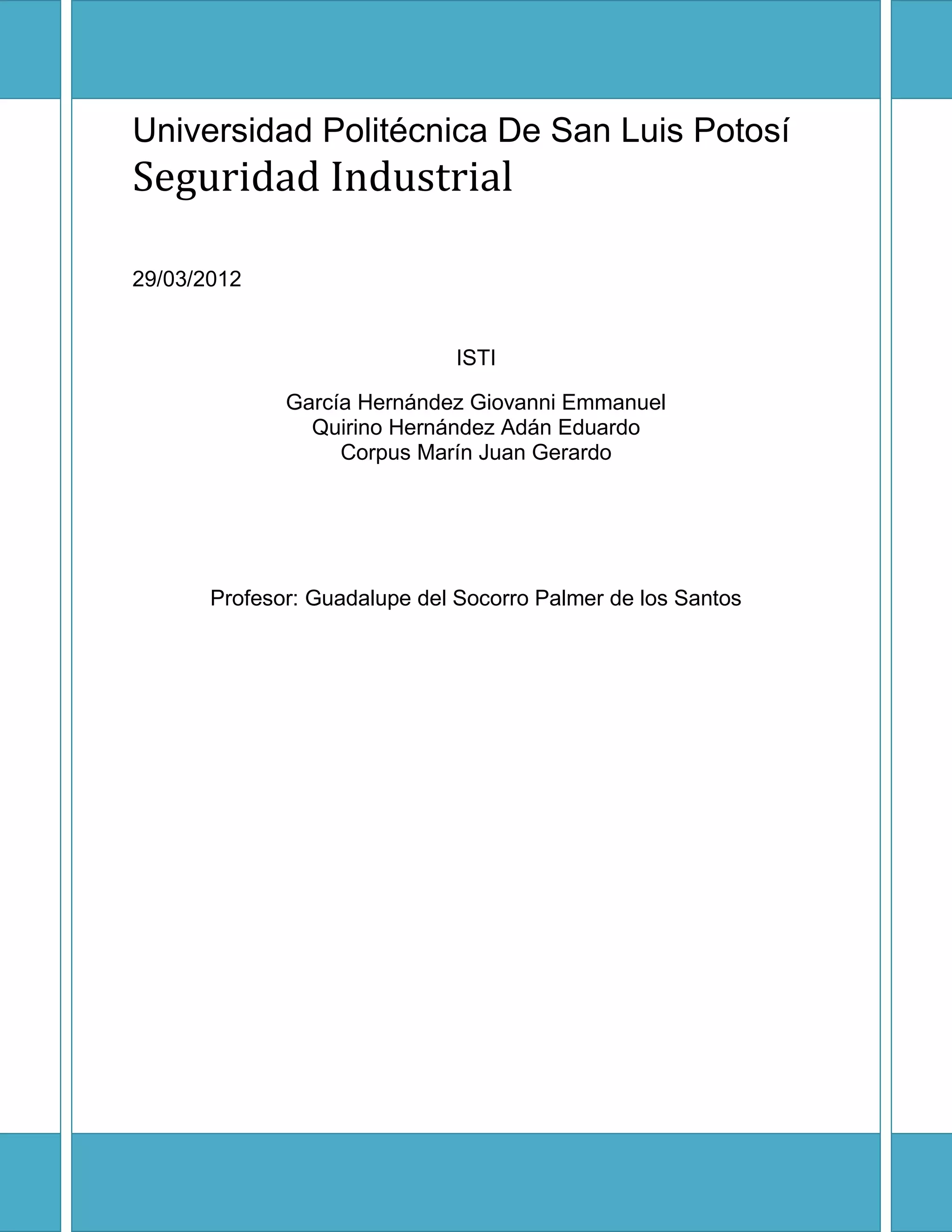Este documento presenta una investigación sobre seguridad industrial en la empresa General Motors México. Explica conceptos clave como prevención de accidentes, supervisores, disciplina de seguimiento, eficiencia y eficacia, y cultura de seguridad. También describe el contexto de la investigación a nivel local, nacional e internacional y analiza fuentes teóricas para respaldar el estudio.