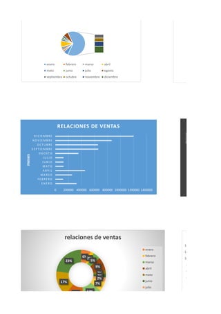 El documento presenta las ventas mensuales de 12 meses. Diciembre tuvo la venta más alta con 1,200,000, mientras que febrero tuvo la más baja con 120,000. Las ventas fueron generalmente más altas en los últimos meses del año.