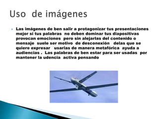 Este documento ofrece consejos para mejorar las presentaciones, incluyendo usar imágenes que evoquen emociones pero sin alejarse del contenido, mantener a la audiencia activa con palabras, contar historias personales, usar viñetas y bromas para mantener la atención, mirar a los ojos a la audiencia e involucrarlos, y tener un hilo conductor coherente a lo largo de la presentación.