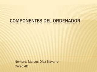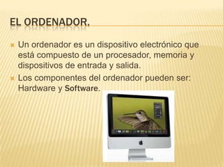 Este documento describe los principales componentes de un ordenador. Enumera 7 componentes internos clave: la placa base, el microprocesador, la memoria RAM, los cables de comunicación, las placas adicionales, los dispositivos de enfriamiento y la fuente eléctrica. También menciona 8 puertos de comunicación externos comunes y varios periféricos externos como el monitor, la impresora, los altavoces, el teclado, la webcam, el escáner y el ratón. Finalmente, señala que el software del ordenador, especialmente