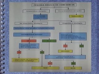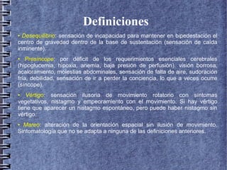 El documento aborda definiciones y clasificaciones del mareo, síncope y vértigo, detallando su fisiopatología, etiología y métodos de diagnóstico. Se enfatiza la importancia de la anamnesis y la exploración física en la identificación del origen de los episodios, así como las pruebas complementarias necesarias para estratificar el riesgo de los pacientes. También se discuten enfoques terapéuticos según la etiología subyacente del síncope y el vértigo, enumerando diferentes síndromes relacionados y su tratamiento.