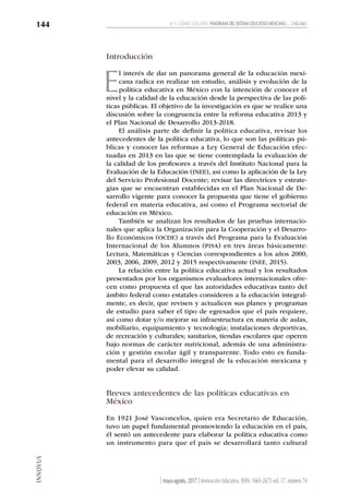 El artículo presenta un análisis del sistema educativo mexicano desde la perspectiva de las políticas públicas, examinando documentos clave y datos de la OCDE para identificar la necesidad de cambios estructurales. Se concluye que es crucial rediseñar planes educativos, mejorar la infraestructura y la capacitación docente, y redefinir los perfiles de egreso de los estudiantes. El objetivo es garantizar una educación de calidad y equidad, haciendo obligatoria la educación hasta nivel medio superior.