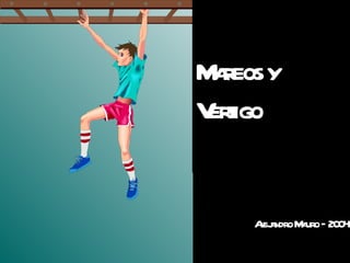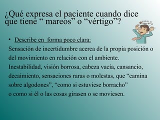 El documento describe diferentes tipos de mareos y vértigo. Define mareo como un término impreciso que involucra desequilibrio e inestabilidad, mientras que vértigo implica una alucinación de movimiento rotatorio. Explica que el primer paso es categorizar el tipo de síntoma reportado por el paciente, siendo las categorías más comunes pacientes con vértigo, síntomas inespecíficos, o desequilibrio. Luego se enfoca en la evaluación y tratamiento del vértigo periférico posicional paroxístico benign