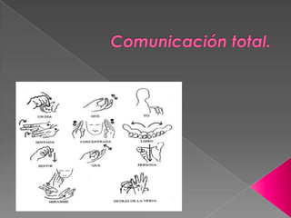 La comunicación no solo implica hablar, sino también entender y ser entendido a través de gestos, postura corporal y expresiones faciales. Históricamente hubo un enfoque oralista que promovía que los sordos hablaran como los oyentes, pero luego surgió un enfoque gestualista que reconoció la lengua de señas como natural para los sordos. La comunicación total acepta diferentes modos de comunicación como el oralismo, lenguaje de señas y lectoescritura, para que cada persona elija la que más le ayude a recibir y expresar mens