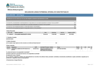 Este documento es la Declaración Jurada Patrimonial Integral de Carácter Público de Margarita Stolbizer. Presenta información personal, laboral y patrimonial de Stolbizer incluyendo detalles de sus bienes al inicio y cierre del período, grupo familiar, evolución patrimonial, ingresos, gastos, y deducciones en el impuesto a las ganancias.