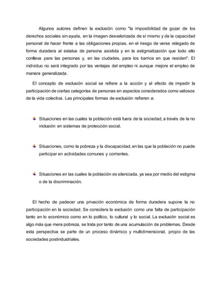 El documento describe la marginación y la pobreza en República Dominicana. Explica que la marginación se refiere a la dificultad de integrarse a los sistemas sociales debido a desventajas económicas, profesionales o de estatus. La pobreza se define como la incapacidad de satisfacer las necesidades básicas. En la República Dominicana, a pesar del crecimiento económico, la pobreza y la desigualdad siguen siendo problemas graves, con aproximadamente la mitad de la población viviendo en la