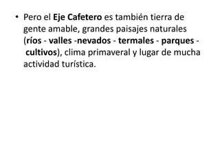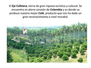 El Eje Cafetero es una región de Colombia conocida por su producción de café de alta calidad y por su riqueza cultural y paisajes naturales. La región ofrece varios destinos turísticos populares como el Parque Nacional del Café, el Parque Nacional Natural Los Nevados y el Parque Temático Agropecuario PANACA, que presentan la cultura del café y la naturaleza de la zona.