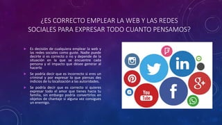 El documento discute el derecho de las personas a expresarse en internet y redes sociales. Argumenta que generalmente es una decisión personal expresar lo que se piensa, aunque podría ser incorrecto si se revela información que ponga en riesgo a uno mismo o a otros. También explora cómo las personas podrían reaccionar si su reputación o la de un ser querido es atacada en línea, y las posibles razones por las que algunos eligen difamar a otros en redes sociales. Finalmente, considera si debería haber consecuencias legales por difamación en