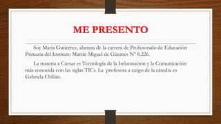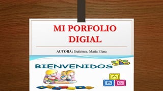 Este documento presenta el portafolio digital de María Elena Gutiérrez, una estudiante de profesorado de educación primaria. El portafolio incluye una introducción, un índice, una sección sobre qué son las TICs, ejemplos de trabajos realizados en clase usando herramientas como CmapTools, PowerPoint, Movie Maker, Word, murales y SlideShare, y una conclusión donde reflexiona sobre su experiencia aprendiendo a usar diferentes tecnologías.