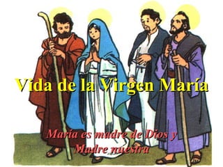 María vivía en Nazaret y aceptó ser la madre de Jesús cuando el ángel Gabriel se lo pidió. Dio a luz a Jesús en un pesebre en Belén y lo acompañó durante su ministerio y crucifixión. Después de la muerte de Jesús, María continuó cuidando a los discípulos y fue llevada al cielo por los ángeles, donde Dios la coronó reina del cielo.