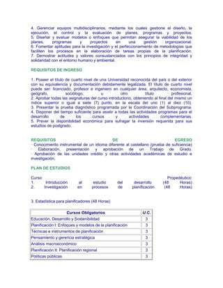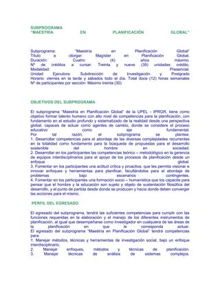 Este documento presenta la información sobre un subprograma de maestría en planificación global. El objetivo es formar profesionales con competencias en planificación desde una perspectiva global para actuar como agentes de cambio. El plan de estudios incluye cursos obligatorios y electivos sobre temas como desarrollo sostenible, políticas públicas y líneas de investigación como desarrollo regional, educación y desarrollo, y planificación en organizaciones sociales.