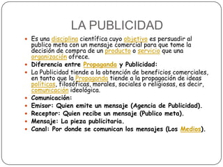 La publicidad es una disciplina científica cuyo objetivo es persuadir al público a través de mensajes comerciales para que compren productos o servicios. Se diferencia de la propaganda en que la publicidad busca beneficios comerciales mientras que la propaganda difunde ideas políticas, filosóficas o sociales. La publicidad utiliza los medios de comunicación como canales para transmitir mensajes de un emisor como una agencia publicitaria a un receptor o público objetivo con el fin de motivarlos a tomar acciones de consumo.