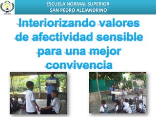 Este documento describe un proyecto pedagógico de investigación realizado por tres maestros en formación en la Escuela Normal Superior San Pedro Alejandrino. El objetivo del proyecto fue generar un cambio en los estudiantes de la IED Agropecuaria la Revuelta en Santa Marta para mejorar la convivencia a través de actividades formativas sobre valores. El proyecto ayudó a los maestros a comprender mejor los problemas de convivencia y los desafíos de la enseñanza.