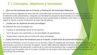 Este documento describe las herramientas para la creación y publicación de contenido didáctico. Explica que estas herramientas digitales facilitan la transmisión de ideas y el conocimiento de forma integrada. También describe los objetivos, funciones, ventajas y desventajas de estas herramientas, así como contenidos digitales, paquetes IMS y SCORM, y características de las herramientas.
