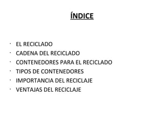 Este documento describe el proceso de reciclaje y su importancia. Explica que el reciclaje consiste en someter materiales usados a un proceso para producir nuevos productos. Detalla las etapas de la cadena del reciclaje como la recolección, clasificación y procesamiento. Además, destaca los tipos de contenedores usados y los beneficios ambientales y económicos del reciclaje como ahorrar recursos y energía.