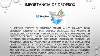 Dropbox permite a los usuarios sincronizar y compartir archivos entre computadoras de manera fácil. Los archivos guardados en la carpeta de Dropbox están disponibles en todas las computadoras del usuario y pueden ser compartidos con otros usuarios de Dropbox o accedidos desde cualquier lugar a través de un enlace de descarga.