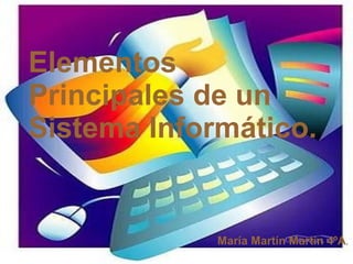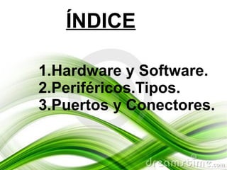 Este documento describe los principales elementos de un sistema informático, incluyendo el hardware, software, periféricos, puertos y conectores. Explica que el hardware son las partes físicas del sistema, mientras que el software son las partes lógicas. También define los diferentes tipos de periféricos de entrada, salida y entrada/salida, así como los puertos lógicos, de memoria, inalámbricos y USB. Por último, detalla los conectores de corriente, VGA, seriales y en paralelo.