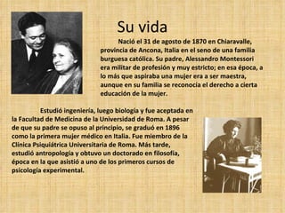 María Montessori fue una pionera en el campo de la educación. Nació en Italia en 1870 y se convirtió en la primera mujer médico de su país. Desarrolló el Método Montessori, el cual se basa en principios como el respeto por los periodos sensitivos del desarrollo infantil, la libertad y autonomía del niño, y la preparación de un ambiente que facilite el aprendizaje. A lo largo de su vida, Montessori escribió varios libros y estableció escuelas basadas en su método, aunque su trabajo