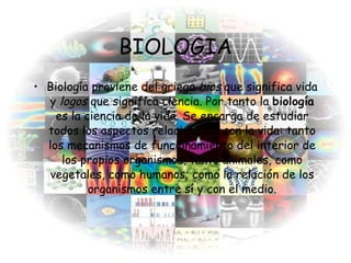 El documento resume las principales ramas de la biología, incluyendo la botánica, zoología, ecología, genética, biología marina y genética del desarrollo. Explica que la biología estudia todos los aspectos de la vida, desde el funcionamiento interno de los organismos hasta sus interacciones y relación con el medio ambiente. Además, destaca que a pesar de la diversidad biológica, existen leyes conservadas que rigen la generación de organismos.