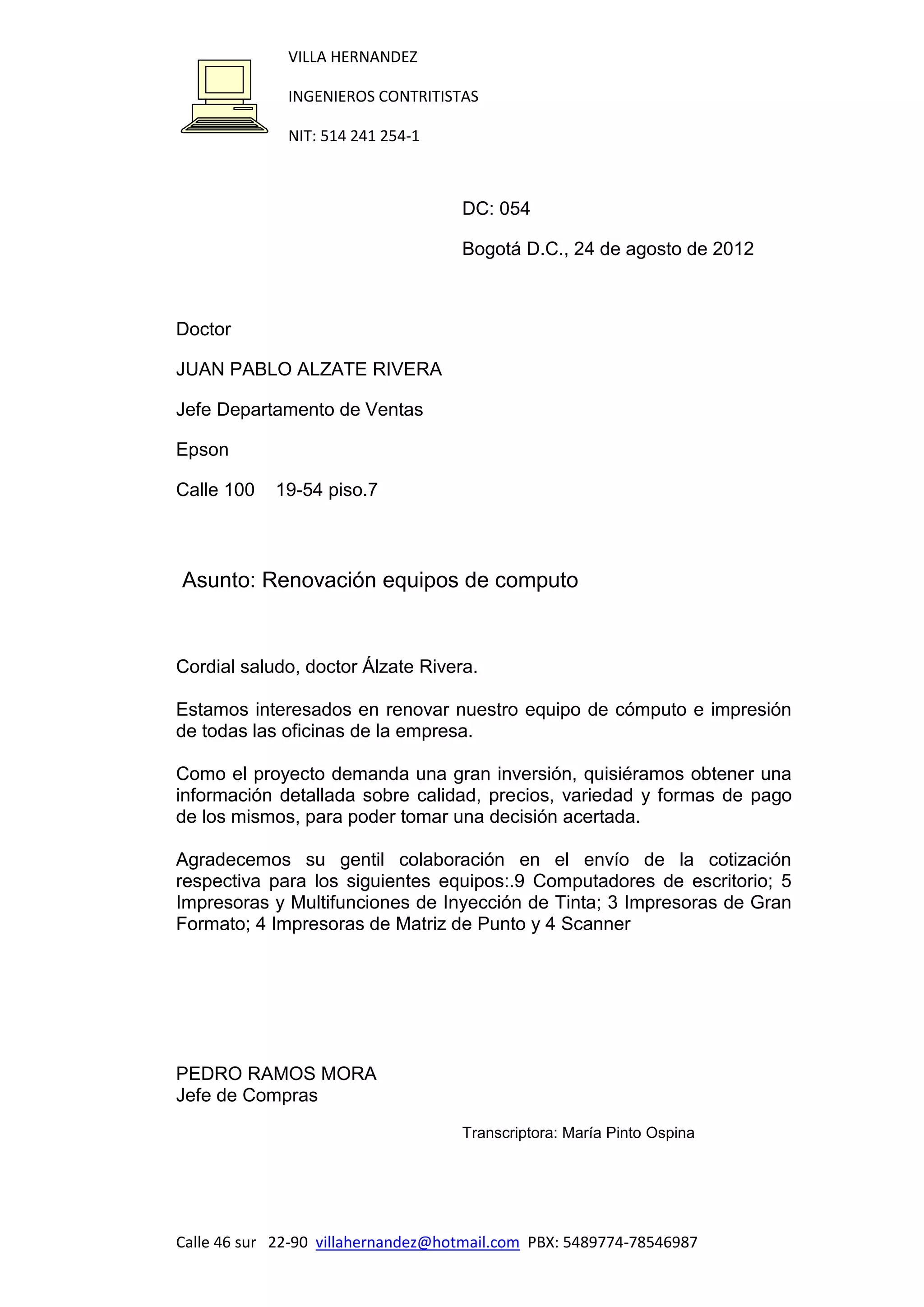 La carta solicita información detallada sobre precios, calidad y formas de pago de equipos de cómputo e impresión para renovar su equipo en todas las oficinas, incluyendo 9 computadores de escritorio, 5 impresoras multifunción de inyección de tinta, 3 impresoras de gran formato, 4 impresoras de matriz de punto y 4 escáneres, con el fin de tomar una decisión acertada sobre la inversión requerida.