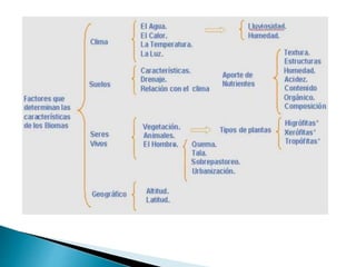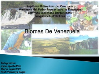 El documento describe los diferentes biomas de Venezuela, los cuales se definen según factores como el clima, suelo y vegetación de cada región. Explica seis biomas principales del país - el bioma xerófilo del norte, el bioma de páramo de los Andes, la selva tropical del delta del Orinoco y sur del Lago de Maracaibo, la selva nublada de los Andes y la Cordillera de la Costa, la sabana de los Llanos Venezolanos, y el bioma de manglar de las zonas costeras - detallando las caracterí