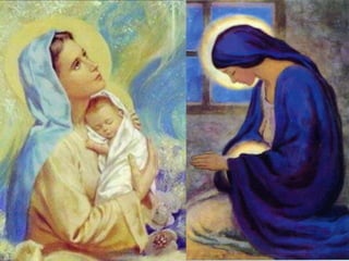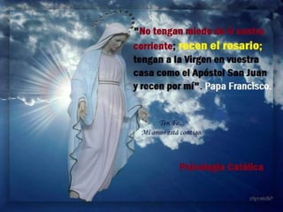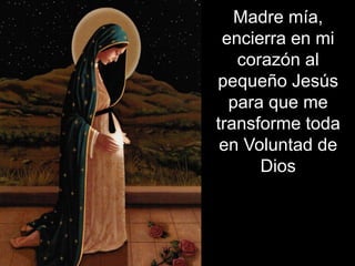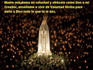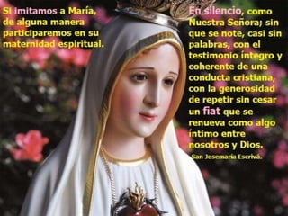 El documento contiene varias citas y reflexiones sobre la Virgen María y su maternidad. Se describe cómo la Virgen María extiende su maternidad para proteger a la humanidad del pecado, consolar a los afligidos, y transformar a las personas en la voluntad de Dios a través de rezar el rosario.