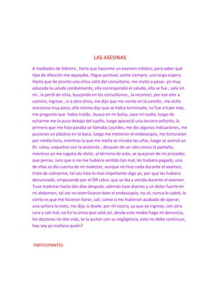 El documento describe una experiencia médica traumática donde tres mujeres - Lourdes, Jacinta y Bárbara - torturaron a la persona que narra el relato durante un examen endoscópico. No esterilizaron adecuadamente el equipo médico y causaron dolor intenso e innecesario durante el procedimiento. La persona sufrió malestares por días después. El relato concluye denunciando la negligencia médica que pone en riesgo la vida de los pacientes.