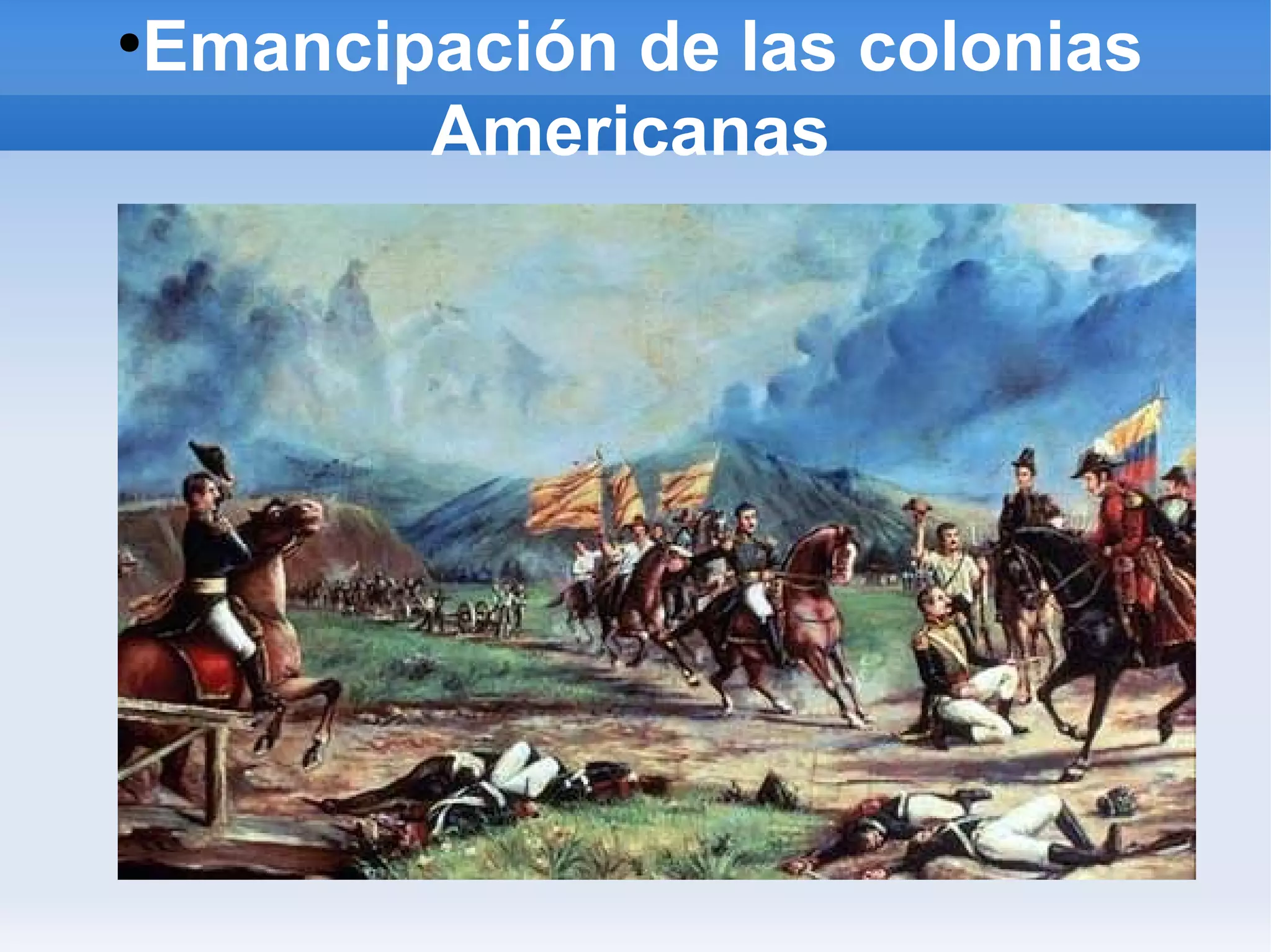 Las causas de la independencia de las colonias americanas incluyen la crisis política en España entre 1808-1814 que aisló las colonias, el desacuerdo de las colonias con las medidas administrativas y fiscales de los Borbones, y el deseo de los criollos de comerciar libremente. Simón Bolívar lideró la lucha por la independencia a través de victorias militares contra España que condujeron a la independencia de Colombia, Venezuela y Ecuador. La independencia dividió el imperio español y llevó a España a convertirse en una potencia sec