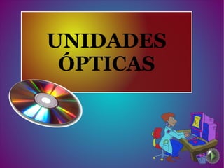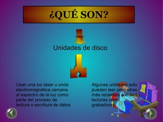 Las unidades ópticas como los CDs y DVDs utilizan un láser para leer y escribir datos almacenados en discos ópticos. Fueron desarrolladas en la década de 1980 por Philips y Sony y han evolucionado para almacenar cada vez más datos a mayor velocidad, incluyendo formatos como el Blue-ray. Funcionan dirigiendo un rayo láser sobre la superficie del disco para reflejar la luz y detectar los datos almacenados.