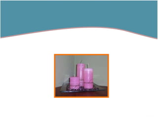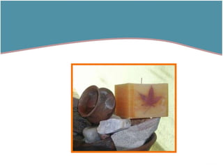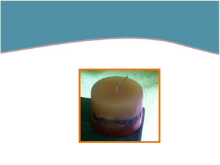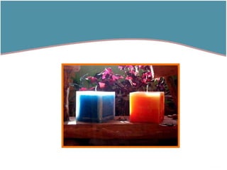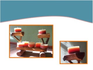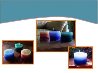 El documento describe diferentes tipos de velas artesanales, incluyendo velas cilíndricas, cuadradas, en forma de pirámide, fanales y en forma de árbol de la vida. También proporciona contacto para adquirir los productos o hacer consultas.