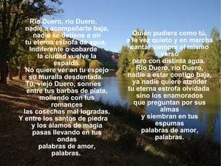 El poema describe al río Duero y cómo ha sido olvidado por la gente de la zona, a excepción de los enamorados. Retrata la belleza del río, pero también cómo la ciudad de Soria le da la espalda y no aprecia su presencia. A pesar del olvido, el río Duero sigue su curso, llevando las palabras de amor de los enamorados que aún se acuerdan de él.