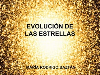 El documento describe la evolución de las estrellas desde su formación a partir de nubes interestelares hasta su destino final. Las estrellas nacen cuando la temperatura central de una nube alcanza los 10 millones de grados y luego pasan por ciclos de fusión de hidrógeno, helio, carbono y otros elementos. Para estrellas como el Sol, la evolución termina con el hierro, mientras que estrellas masivas continúan fusionando hasta el hierro. El destino final depende de la masa, con estrellas menos masivas convirtiénd