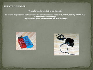 El documento proporciona instrucciones para construir un circuito que incluye una fuente de poder de 5,000-10,000 V y 30-100 mA, capacitores para televisores de alto voltaje, un spark gap hecho de dos tornillos, una bobina primaria hecha de alambre de cobre enrollado alrededor de la tapa de una lámpara de mesa, una bobina secundaria similar, un toroide hecho de platos de acero u aluminio, y bobinas "choke" hechas de alambre enrollado dentro de tubos de bolígrafo