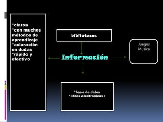 Las bibliotecas ofrecen varios métodos para el aprendizaje, incluyendo espacios claros con muchos recursos, ayuda para aclarar dudas de manera rápida y efectiva, y una base de datos con libros electrónicos, juegos y música.