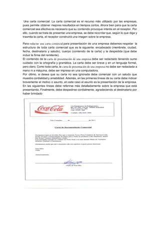 El documento describe diferentes tipos de documentos comerciales como cartas comerciales, memorandos, facturas de agua y energía, y certificados de estudio. Una carta comercial se usa para presentar una empresa y debe incluir la estructura, contenido y tono adecuados. Un memorando es un documento breve usado para comunicar información internamente. Las facturas de servicios públicos incluyen datos del cliente, consumo, tarifas y otros cargos. Un certificado de estudios confirma la inscripción o estudios de una persona en una instituc