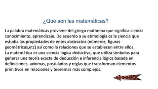Las matemáticas son la ciencia que estudia las propiedades de entes abstractos como los números y figuras geométricas, y las relaciones entre ellos. Es una ciencia lógica deductiva que utiliza símbolos, definiciones, axiomas y postulados para generar teorías exactas mediante deducción e inferencia lógica. Las matemáticas provienen del griego "mathema" que significa conocimiento o aprendizaje.