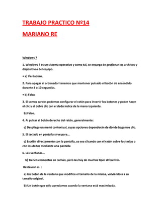 Este documento presenta un trabajo práctico sobre Windows 7. Contiene preguntas y respuestas sobre varios temas como el sistema operativo en sí, el explorador de archivos, la búsqueda, la papelera de reciclaje y más.