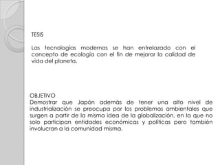 Este documento describe el desarrollo de la ecología industrial en Japón, incluyendo las leyes y políticas implementadas para promover la reducción de desechos, el reciclaje y la simbiosis industrial. Explica cómo Japón ha establecido parques eco-industriales y ciudades que integran la industria con los sistemas naturales para mejorar la eficiencia de recursos y reducir el impacto ambiental. El documento también resalta algunos ejemplos exitosos de parques eco-industriales en ciudades japonesas como Kawasaki, Kit